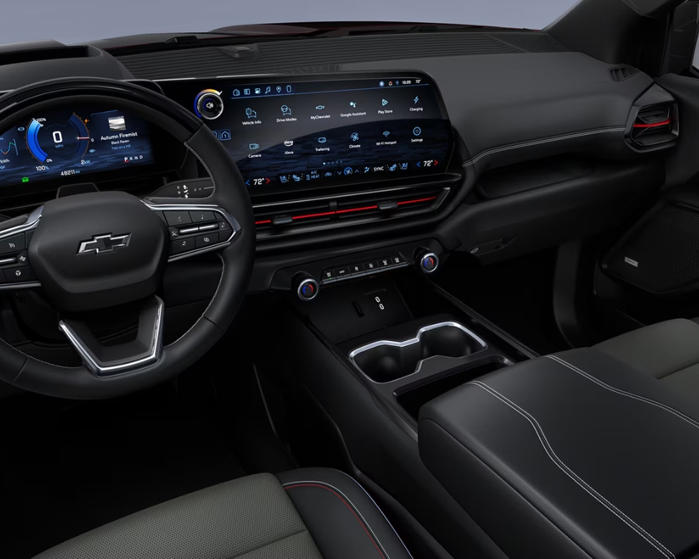 Inside, the Silverado EV is designed to feel high-tech yet simple to use. At the centre of the cabin, there is a huge 17.0-inch touchscreen that works alongside an 11.0-inch driver display, giving you clear access to everything you need.Wireless Apple CarPlay and Android Auto come standard, while a built-in wireless charger keeps your devices powered without the clutter of cables. Music and calls sound sharp through the premium audio system, making every drive across Ontario more enjoyable. Everyday convenience features like keyless entry, push-button start, and power door locks make getting in and going easier. To top it off, an available glass roof opens the cabin with natural light, creating a spacious and inviting feel on every trip.